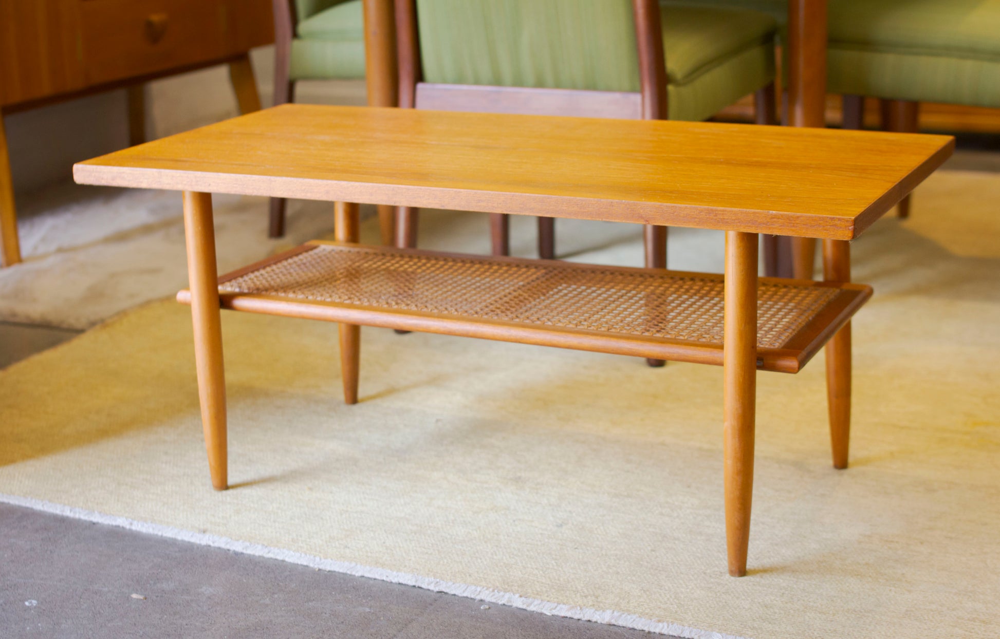 Featuring a beautiful teak veneer top, cigar legs and a rattan shelf, this piece is simply oozing style.