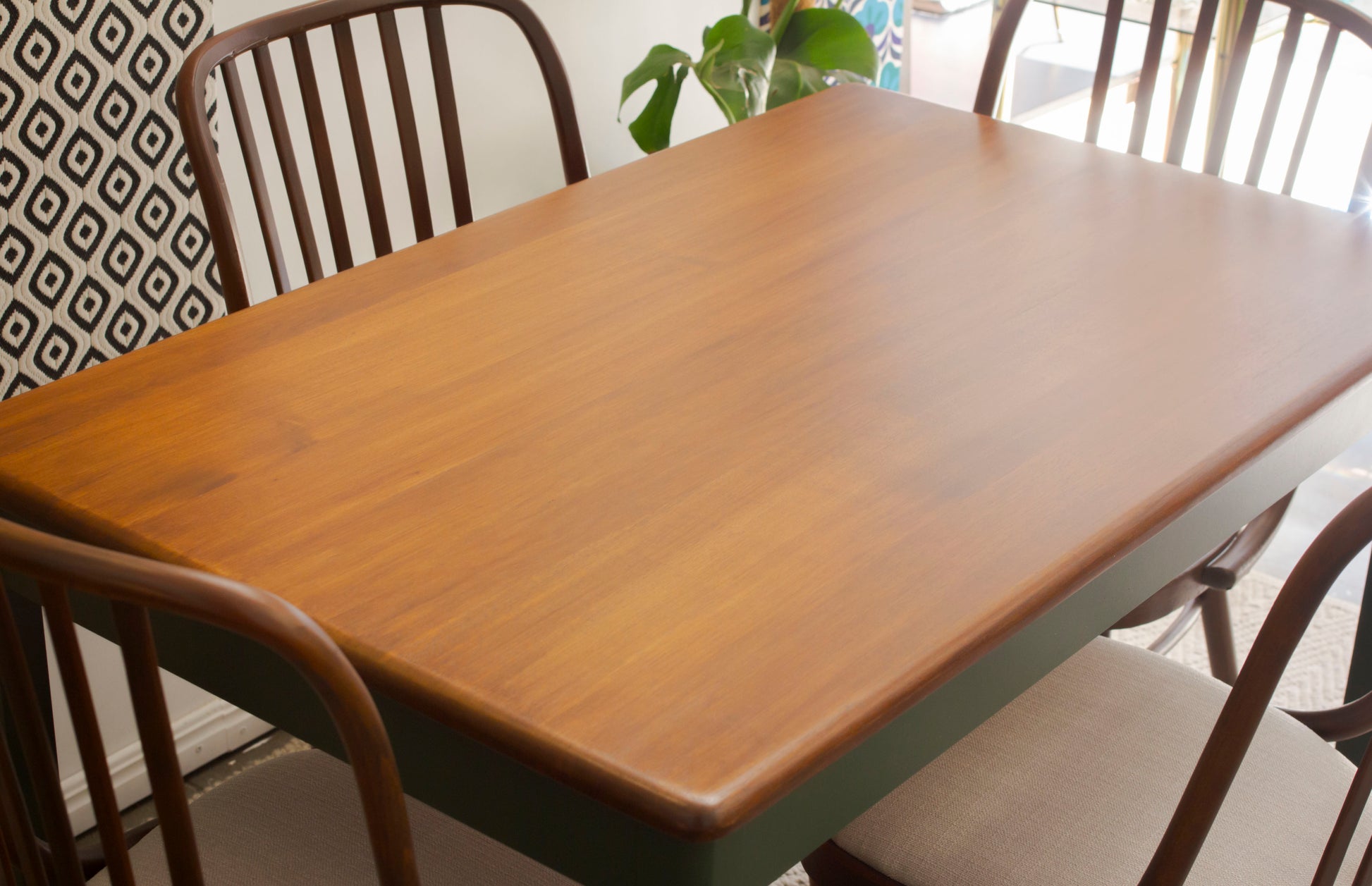 It has been refurbished with an earthy green base and a warm walnut finish for the top surface.