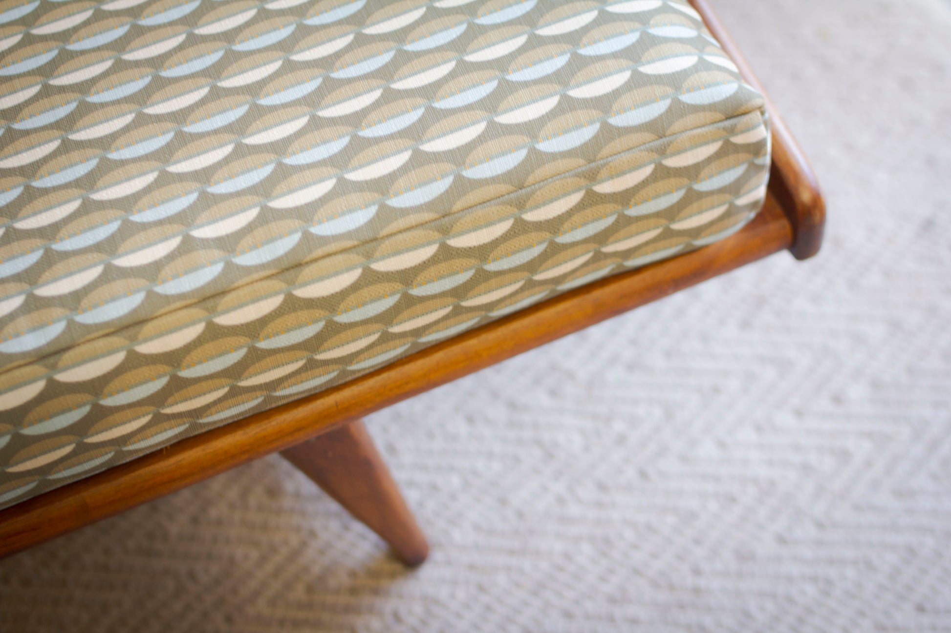 The daybed has a freshly reupholstered mattress cover. The material is a thick and durable canvas with an absolutely adorable retro pattern.